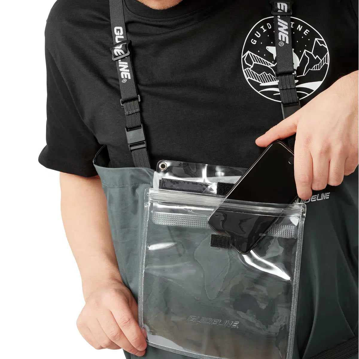 La tasca impermeabile in TPU staccabile fa in modo che possiate utilizzare il vostro telefono senza doverlo estrarre. I piedini per calze perfette sono la soluzione più sostenibile e funzionale che esista, grazie all'utilizzo di gomma naturale Yulex® a base vegetale e di una suola ad alta densità a base di calcare. Questo in combinazione con le protezioni di ghiaia in tessuto principale, forniscono il miglior abbinamento con i vostri scarponi e lunghe giornate di trekking e pesca. Il materiale del Wader ULCB è a due vie mecanico stretch, 2,5 strati di Nylon riciclato nella parte superiore della gamba anteriore e sopra la vita. Sotto la vita usiamo un tessuto di Nylon riciclato a 3,5 strati. Impermeabilità di 25.000 mm e traspirabilità di 8.000 g/m2/24h in tutto il wader.