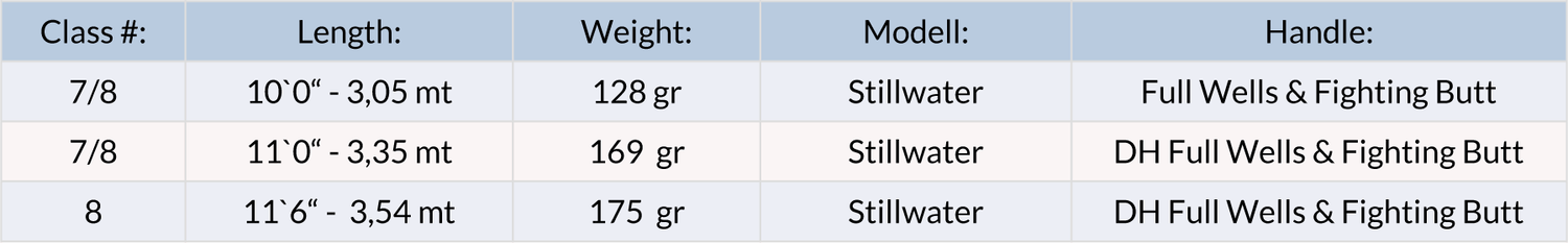 Il modello 10`0 #7/8 possiede un manico full wells & calcio di combattimento mentre i modelli 11`0 e 11`6 hanno un doppio manico full wells allungato & calcio di combattimento e permettono lanci lunghi rollcast senza ulteriore forza.
