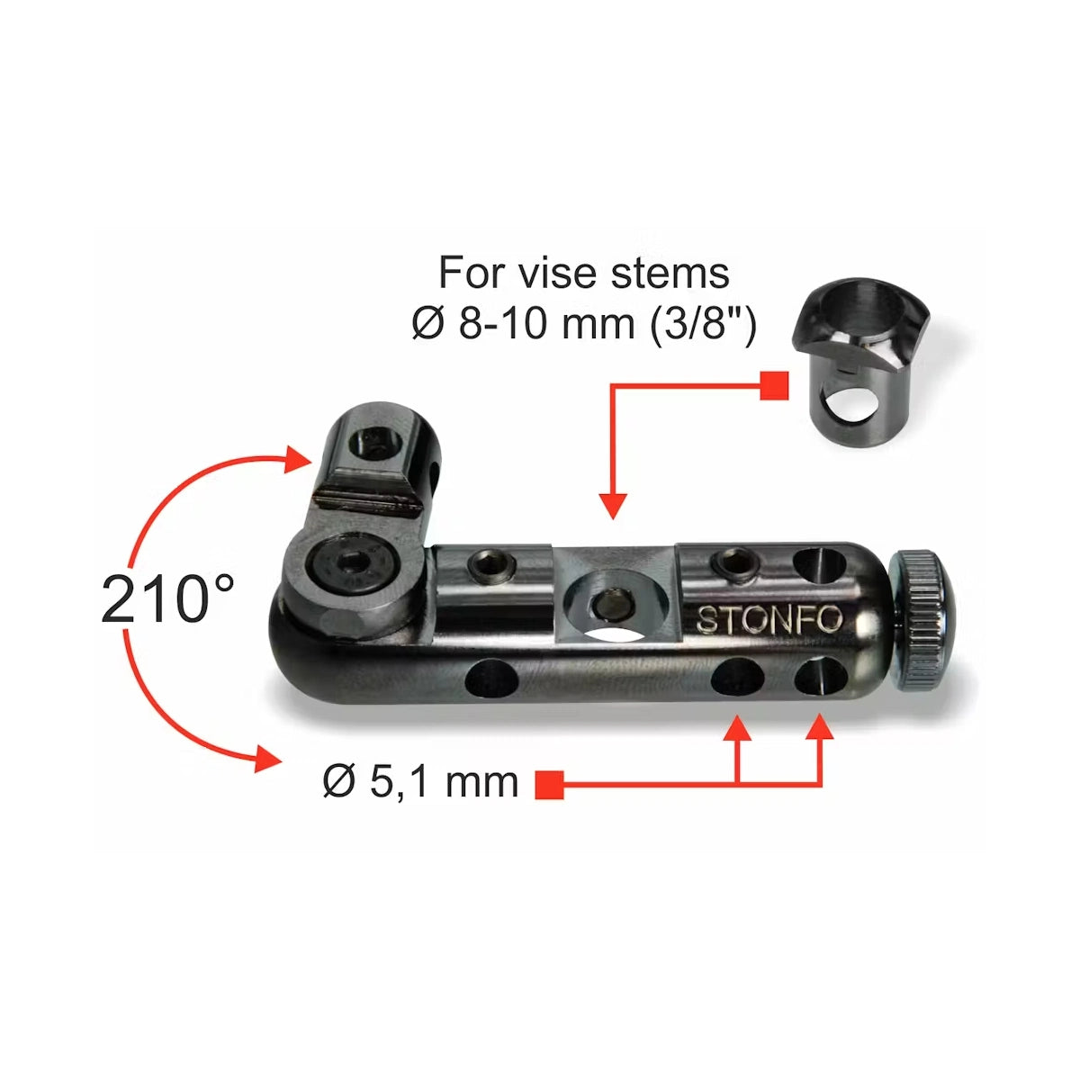 Blocchetto snodato per morsetto. Esso permette di bloccare fino a quattro accessori contemporaneamente. Adatto per morsetti con stelo da 8 mm a 10 mm (3/8"). Fornito con boccola di riduzione per stelo da 8 mm e chiave a brugola.