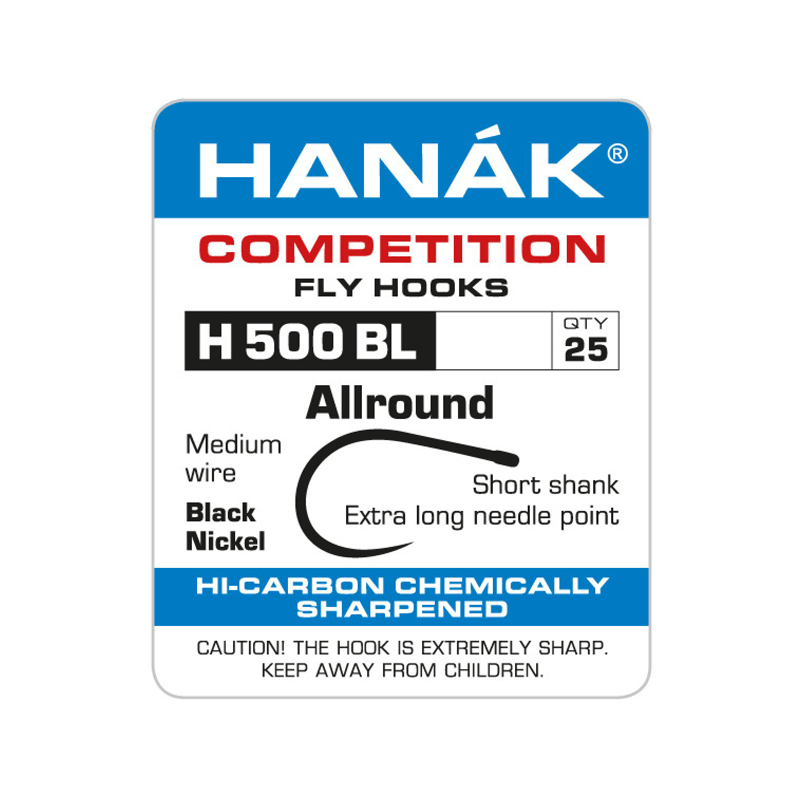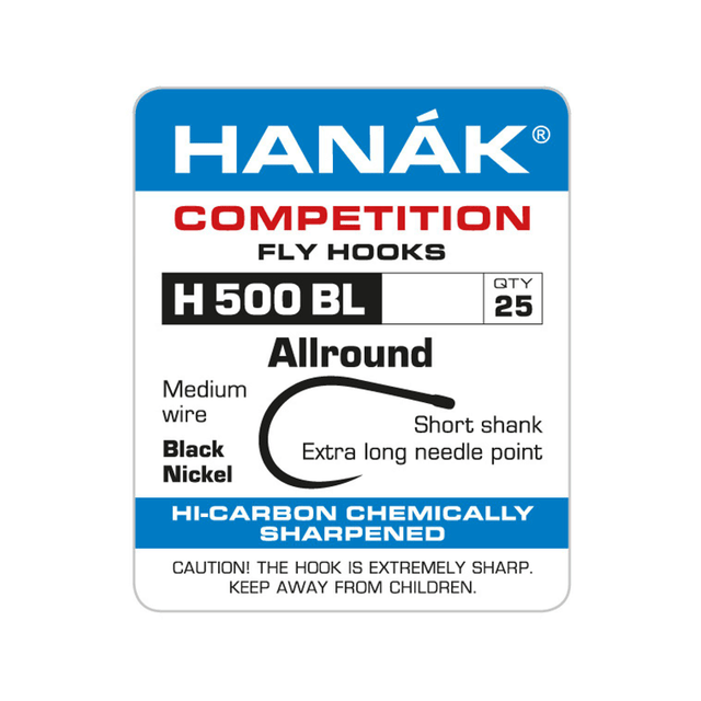 Tutta la serie di ami Hanak sono senza ardiglione è rappresentano il massimo di ciò che è tecnicamente possibile fabbricare. Sono fabbricati con acciaio al carbonio di altissima qualità con le punte affiliate chimicamente. Gli occhielli sono chiusi perfettamente e prive di spigoli. Sviluppati, testati e consigliati dai più famosi garisti e pescatori a mosca professionali. Modello H500BL è disegnato per la costruzione di mosche secche, sommerse e ninfe.