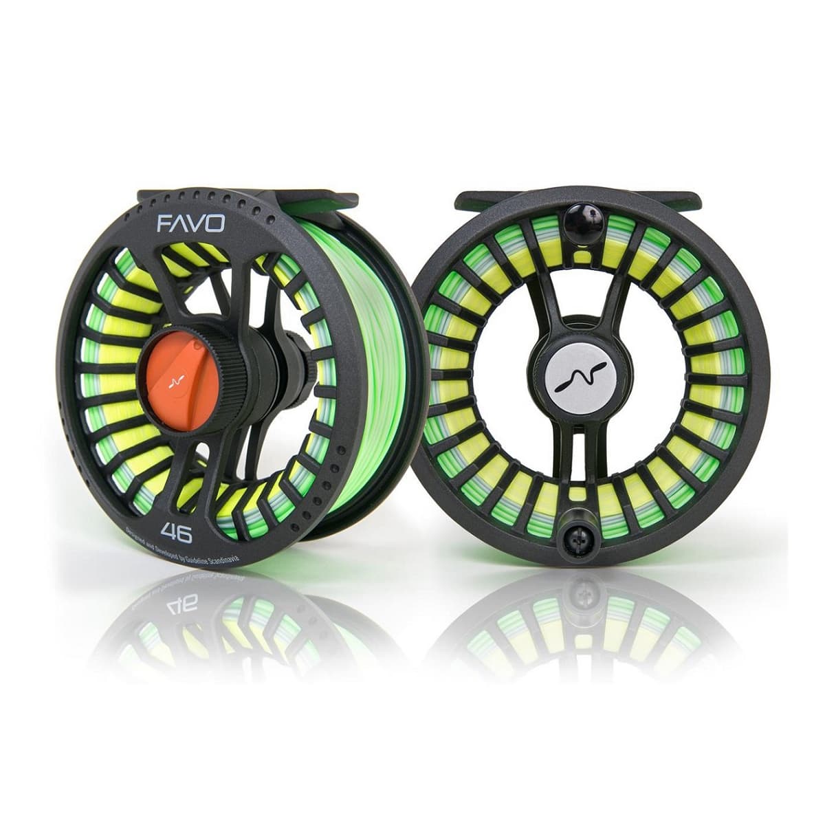 Das Modell 810 verfügt außerdem über zusätzliche X-Truss-Stützen und hat ein doppeltes 5-Speichen-Muster sowohl auf der Spule als auch auf dem Rahmen. Die Rückholrichtung auf den Spulen lässt sich leicht ändern und dauert nur wenige Minuten. FAVO hat ein halbmattes Finish in Dark Gunmetal auf dem Rahmen und der Spule mit schwarzen Knöpfen und Details. Zwei orangefarbene Metallplättchen mit GL-Schlangenlogo befinden sich auf den Auslöseknöpfen für Spule und Bremse. Die Spulen werden in einem Nylonetui geliefert.