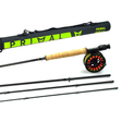 The complete set includes a 4-piece fly rod, a matching fly reel, balanced WF fly line, and a protective travel tube.